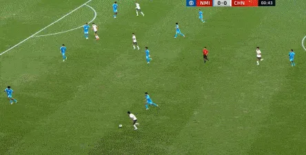 开场之后,中国队全面前压,对手也没有什么控球能力,这让中国队很少呈现无球阶段的站位,但在有球的时候,你还是可以轻松看到中国队摆出了双前锋: