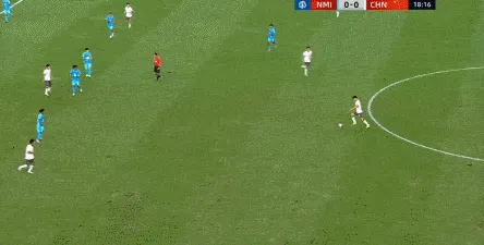 所以在这种低效进攻所导致的急躁情绪下,中国队甚至开始从后卫线送出长传,在线路和轨迹直冲门将的情况下,这更不是一个好主意: